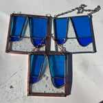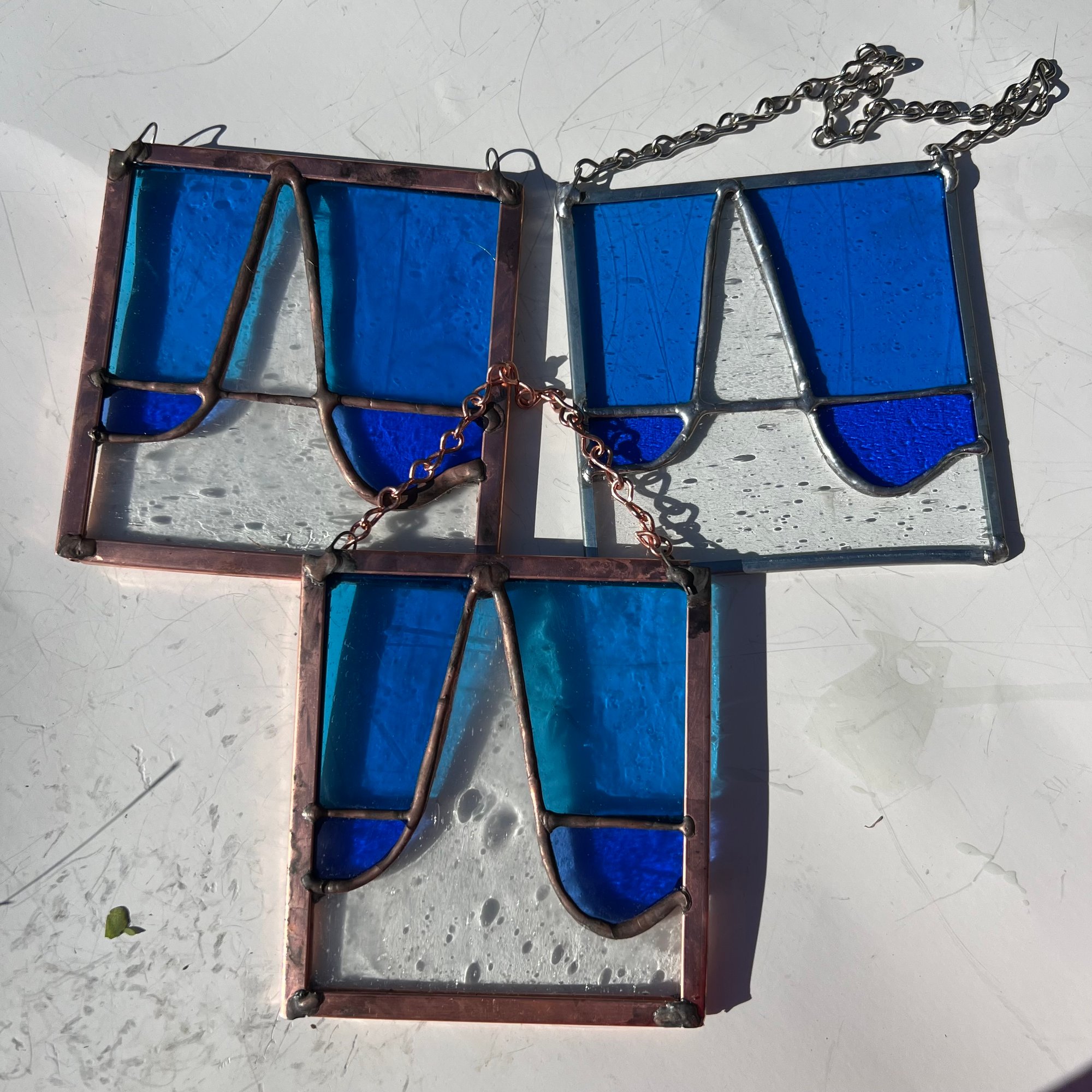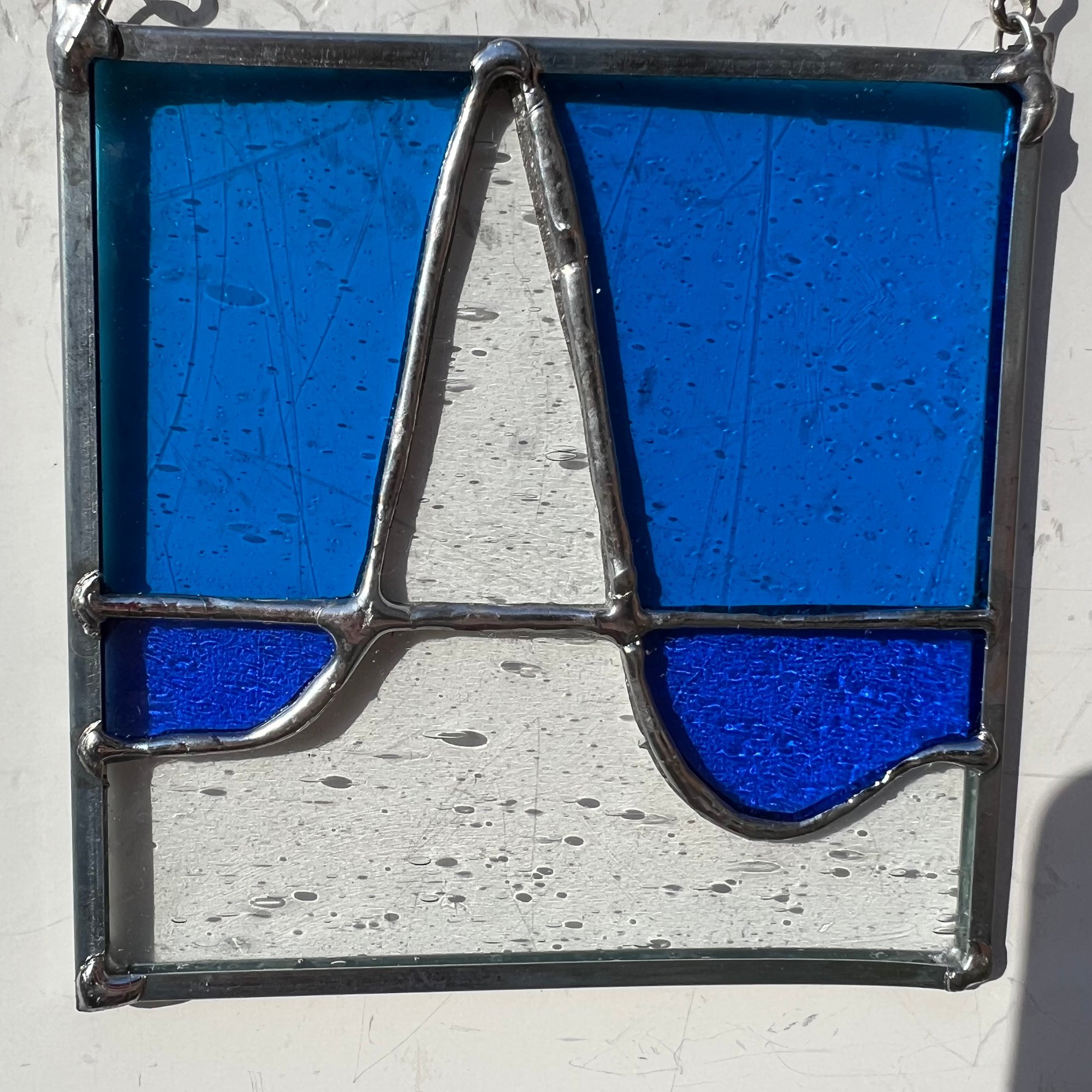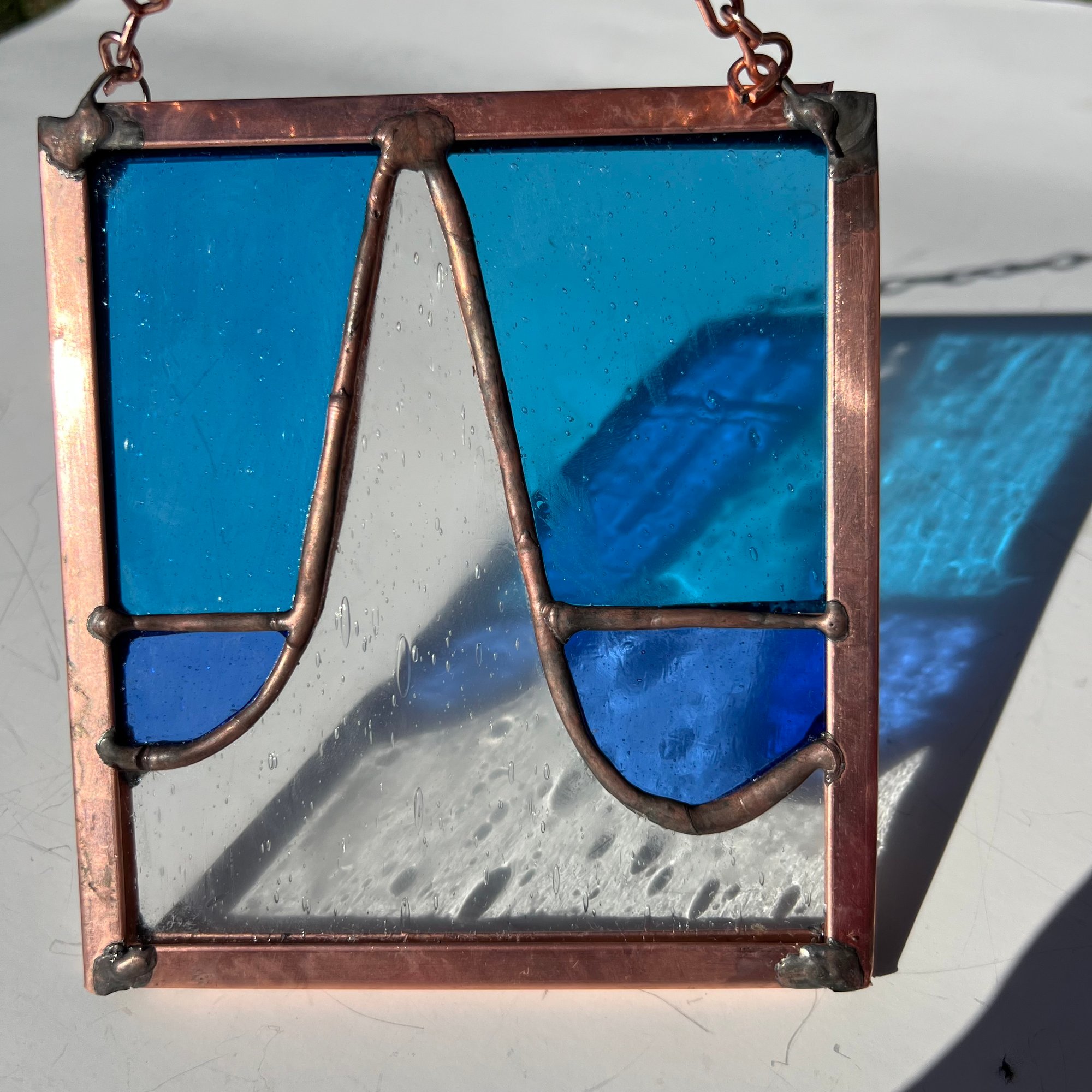 Stained glass action potential, with or without line depicting polarization threshold. Handmade with frame and chain.