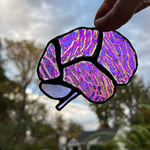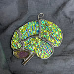 Small suncatcher using rare dichroic ripple glass to depict the four lobes of the brain as well as brainstem and cerebellum. Dichroic glass was developed by NASA and displays different colors depending on whether light is reflected or refracted. Measures about 4.5" wide x 3.5" high. This one is green when light is reflected and magenta when light is refracted. Available with black or silver patina.