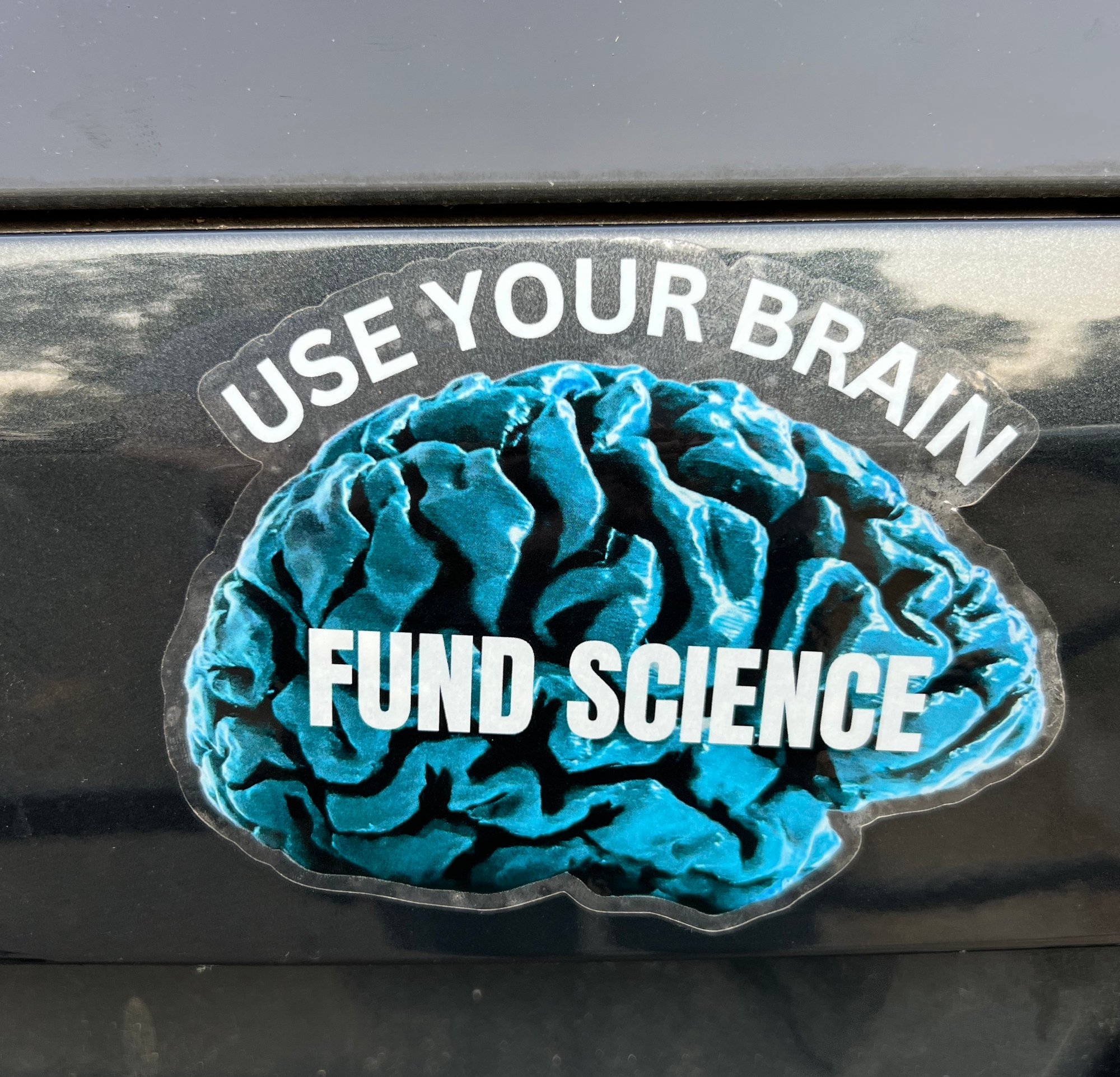 Die cut vinyl sticker. Teal brain on clear background. Text reads ""USE YOUR BRAIN - FUND SCIENCE". 5" w x 4" h, waterproof. Limited quantities available.